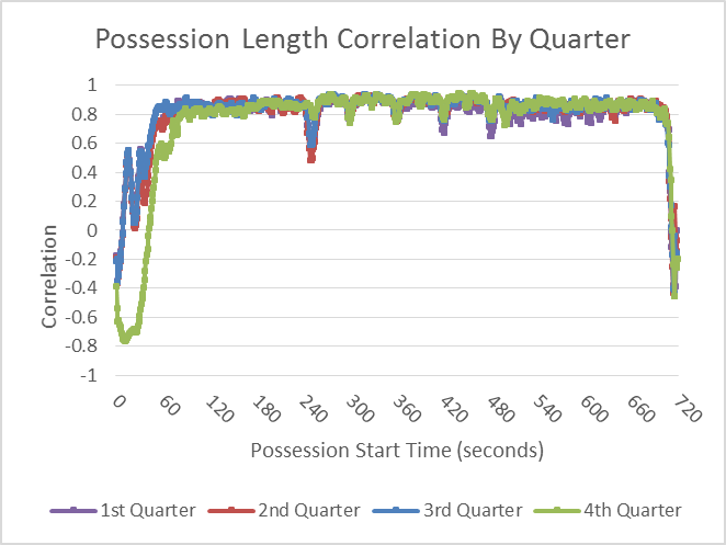 Here is a chart showing how correlation compares with "normal" across all possession start times in a game2: